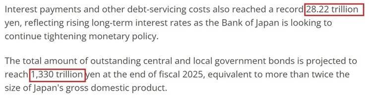 值得注意的是,在石破政府向国会提交的2025财年预算案中,光是用于偿还国债和支付利息的相关费用就高达28.22万亿日元,为历史最高值。