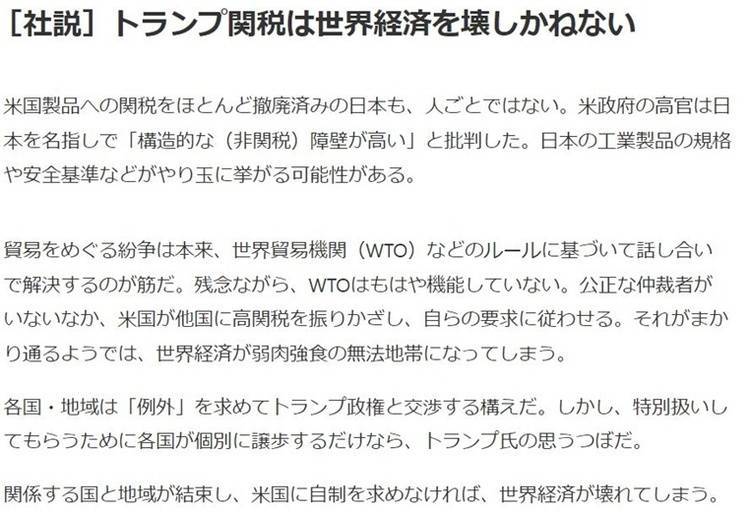 社论认为,一旦特朗普政府正式启动其关税措施,包括日本在内的世界各国经济将受到不可估量的打击。“如果相关国家和地区不能团结起来阻止这种弱肉强食的事情发生,世界经济将会崩溃。”