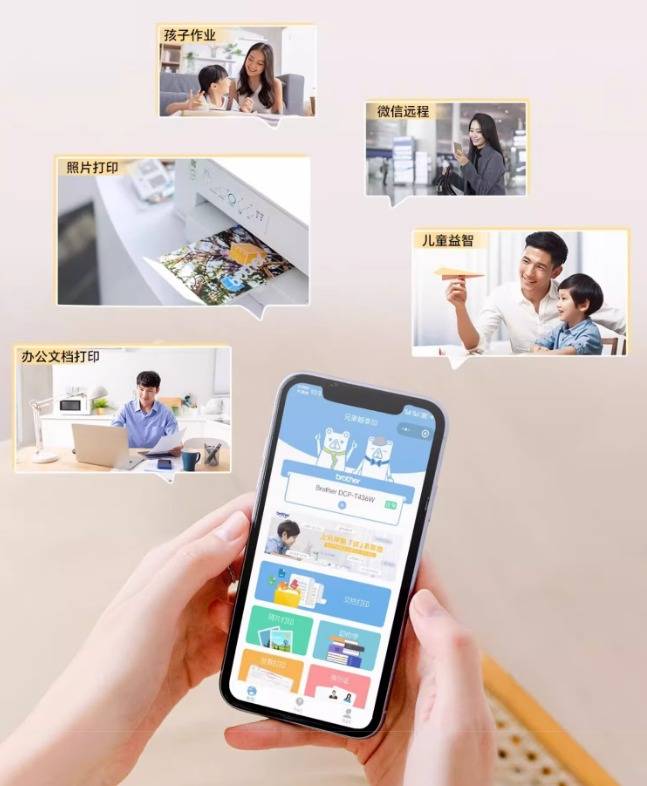 兄弟DCP-T436W还支持微信小程序打印,操作简单易懂,即使是不太熟悉电子设备的老人和孩子也能轻松上手。而且,即使你不在家,也能通过远程操作实现打印体验,真正做到了随时随地想打就打。此外,兄弟畅享印小程序还自带内容模板,包含丰富的教育资源和办公模板,是学习的好帮手,让打印机秒变学习机。