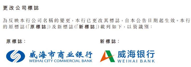 与此同时,威海银行更改其标志,自本公告日期起生效。该行的原标志及新标志分别如下: