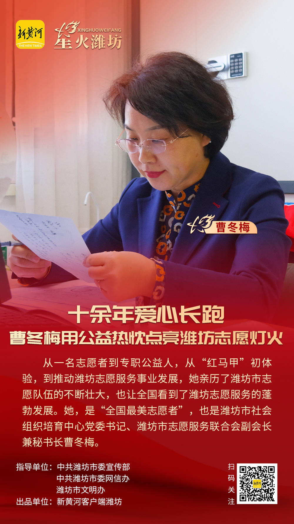 从一名志愿者到专职公益人,从“红马甲”初体验,到推动潍坊志愿服务事业发展,她亲历了潍坊市志愿队伍的不断壮大,也让全国看到了潍坊志愿服务的蓬勃发展。她,是“全国最美志愿者”,也是潍坊市社会组织培育中心党委书记、潍坊市志愿服务联合会副会长兼秘书长曹冬梅。