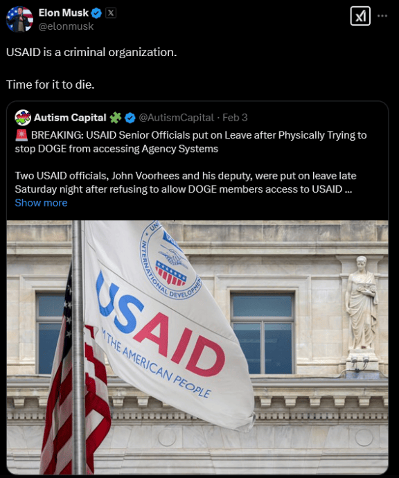 马斯克称USAID是一个犯罪组织,是时候让它消亡了